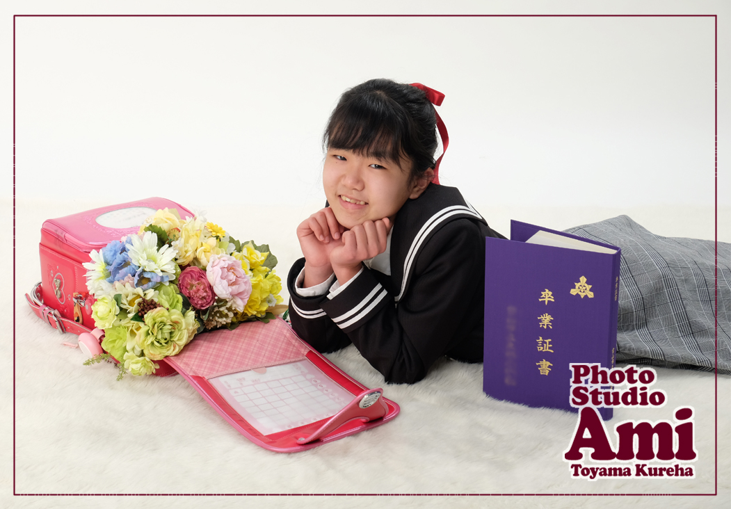 ちょっと大きめの制服、ピカピカのランドセルと一緒に新しい一歩をふみだした晴れ姿。